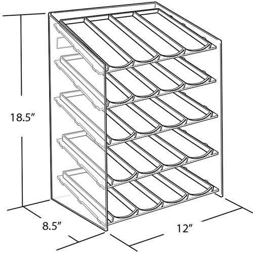 Five-tier 20-compartment display measures 12"W x 8.5"D x 18.5"H. Each slot measures 2.375"W x 7.75"D. Use this display on pegboard, slatwall, or counter top. Includes two plastic U-Hooks.