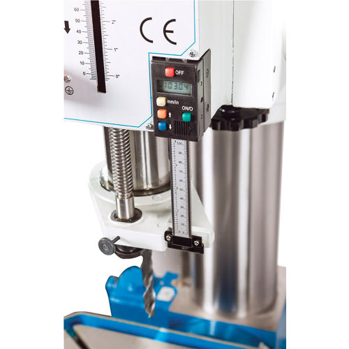 Production Drill Press with infinitely variable speed and tapping feature. Ideal for single part and series productions, for drilling, countersinking, reaming and tapping. Features: Very rigid construction with thick-walled column and large throatInfinitely variable speed adjustment with back gearing and digital speed display4 automatic drill feeds with electromagnetic clutch control and automatic shut-off when reaching the limit stopMotorized table height adjustmentsDigital boring depth displayLarge drilling table with circumferential coolant groove, height adjustement, and +/- 45 swivel rangeTapping unit is standardWorking area: Drilling capacity: 1.57"Tapping capacity, steel: M 24Table set up area: 21 x 17"Quill stroke: 7"Manual table travel: 22.44"Powered table travel: 16.93"Table swivel range (max.): +/- 45 Column diameter: 6"Spindle nose-to-table distance (max.): 26"Spindle nose-to-foot distance: 47"Throat: 13"Headstock: Speed range: 60 - 2,600 rpmSpindle mount: MT 4Feed: Quill feeds: 0.004; 0.008; 0.012; 0.016 (4) in/R in/RDrive capacity: Motor rating main drive: 2.7 HPMeasures and weights: Overall dimensions (L x W x H): 39.37" x 25.59" x 87.4"Weight: 1,100 Lbs.