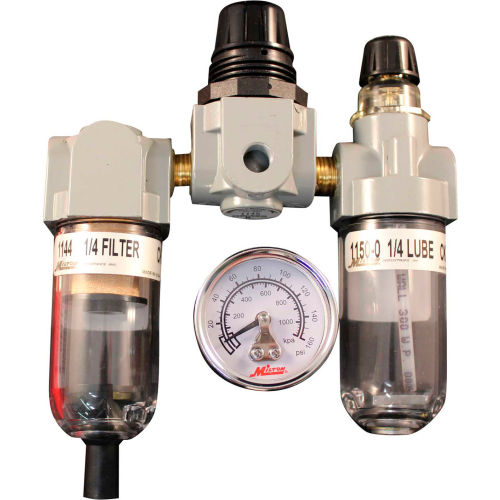 The mini 1/4" NPT FRL trio is recommended when space is a problem. Mini FRL trio offers the same features as the full size units. Pre-assembled with 0-160 PSI gauge #1189 filter #1144 regulator #1145 and lubricator #1150. Has a Maximum pressure of 150 PSI and Maximum SCFM of 20.