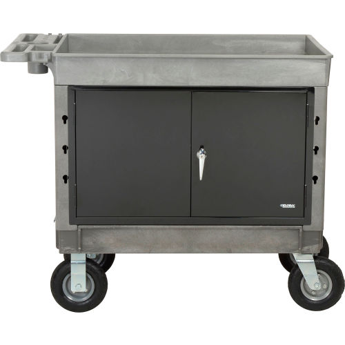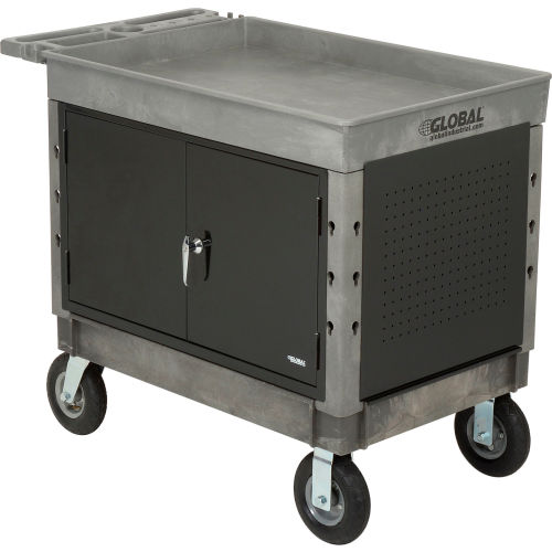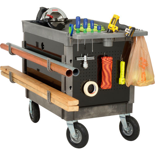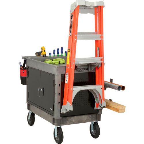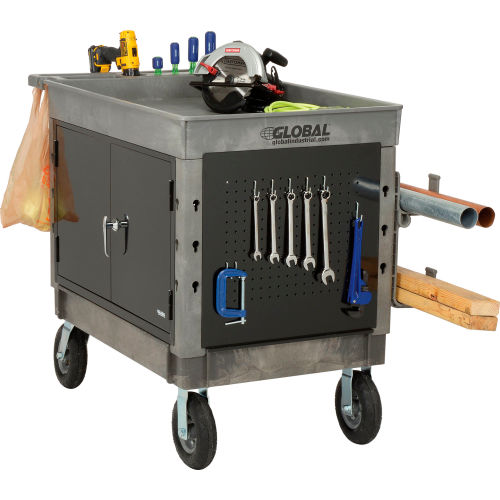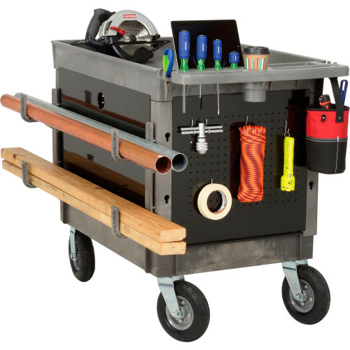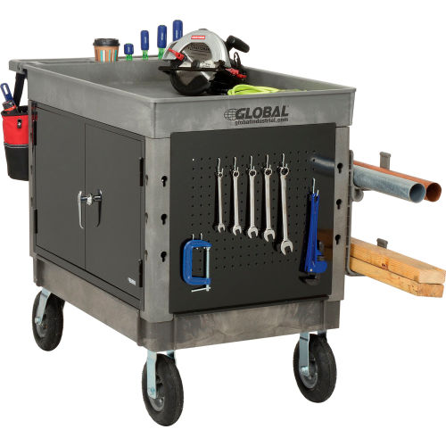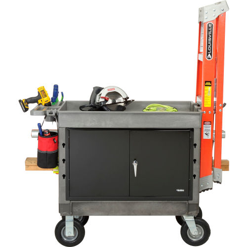 Rugged Industrial Strength plastic stock and utility cart has steel locking doors and sides with steel pegboard at both ends for secure storage and organization. Cable management opening on back allows cart to be used as a mobile charging station for rechargeable tools. Pegboard end panel prevents heat build-up from electronics. Steel enclosure secures valuables with 2 point locking mechanism that captures and locks both doors. Locking chrome door handle includes 2 keys. Perforated end panels serve as a pegboard with handy organization hooks (sold separately). This high quality cart is virtually maintenance free and perfect for industrial, commercial or office applications. Easy-to-clean structural plastic cart won't rust, dent, peel, or chip. Cart features 2-5/8" deep, leak-proof shelf trays with 2 swivel and 2 rigid non-marking pneumatic wheels that provide a smooth ride over rough surfaces. Comfort grip push handle for effortless steering. Cart Features: Molded-in tablet holderDrill/Cup holderStorage tray(4) Screw driver holders(2) Tool/Bag hooks on left and right ends of the handle Support legs offer 4" spaced slots on each side of the legs to hold specialized accessories to increase your productivity. Choose from hooks, spool holders or utility bins, ladder holders and power strips all designed to improve the functionality of these carts, sold separately. 500lb capacity; 250lb per shelf evenly distributed. Easy assembly. New and improved design replaces previous model 241865.
