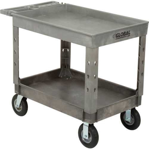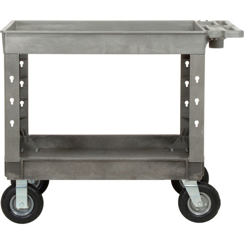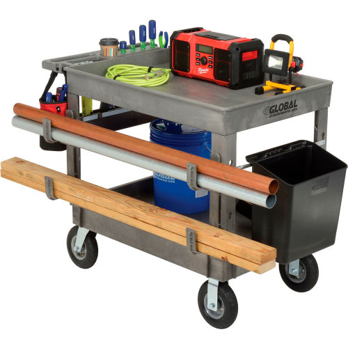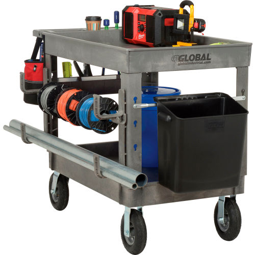 Make your move with this Industrial Strength plastic stock and utility cart. This high quality cart is virtually maintenance free and perfect for industrial, commercial, medical, or food service applications. Easy-to-clean structural plastic cart won't rust, dent, peel, or chip. Cart features 2-5/8" deep, leak-proof shelf trays with 2 swivel and 2 rigid non-marking 8" pneumatic casters. Comfort grip push handle for effortless steering. 1 Year Limited Warranty. Cart Features: Molded-in tablet holderDrill/Cup holderStorage tray(4) Screw driver holders(2) Tool/Bag hooks on left and right ends of the handle Support legs offer 4" spaced slots on each side of the legs to hold specialized accessories to increase your productivity. Choose from hooks, spool holders or utility bins, ladder holders and power strips all designed to improve the functionality of these carts, sold separately. 500 lb. capacity; 250 lb. per shelf evenly distributed. Easy assembly. New and improved design replaces previous Model 241568.