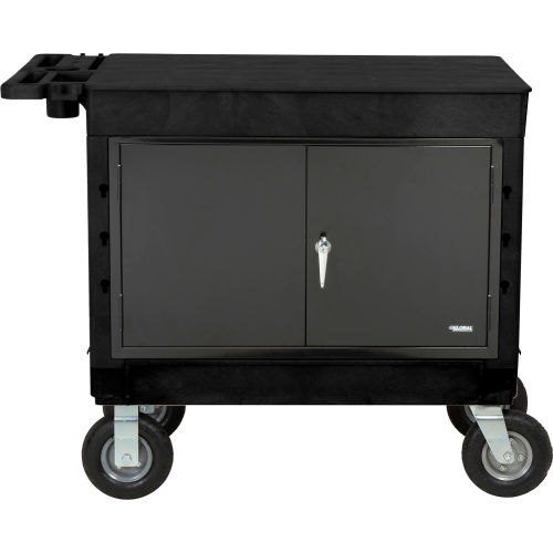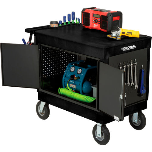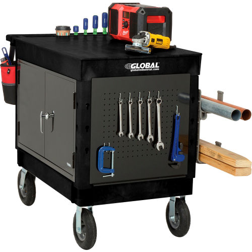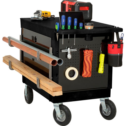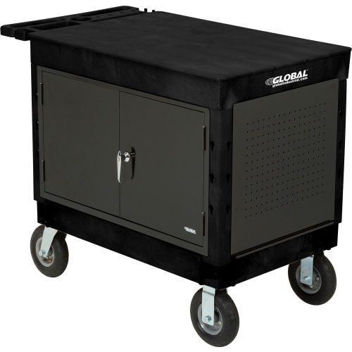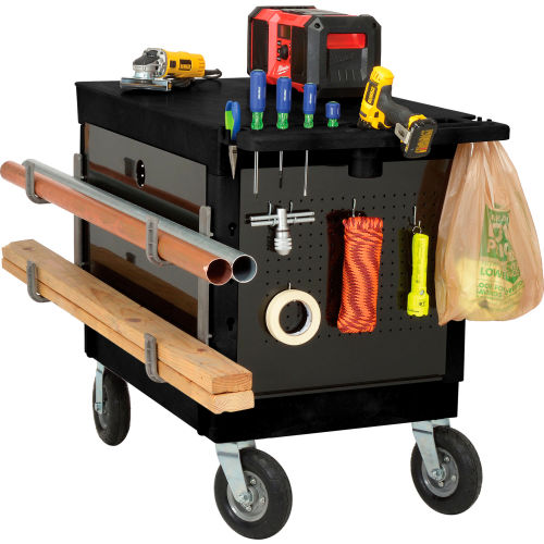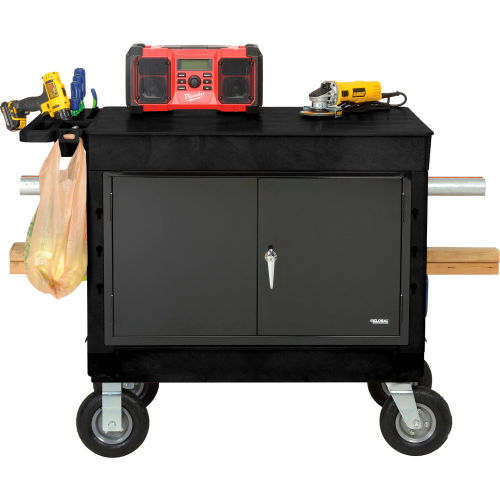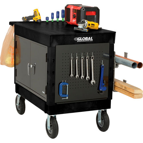 Rugged Industrial Strength plastic stock and utility cart has steel locking doors and sides with steel pegboard at both ends for secure storage and organization. Cable management opening on back allows cart to be used as a mobile charging station for rechargeable tools. Pegboard end panel prevents heat build-up from electronics. Steel enclosure secures valuables with 2 point locking mechanism that captures and locks both doors. Locking chrome door handle includes 2 keys. Perforated end panels serve as a pegboard with handy organization hooks (sold separately). This high quality cart is virtually maintenance free and perfect for industrial, commercial or office applications. Easy-to-clean structural plastic cart won't rust, dent, peel, or chip. Cart features smooth flat top shelf for worksurface or easy loading/unloading of oversized cargo and a 2-5/8" bottom, leak-proof shelf trays with 2 swivel and 2 rigid non-marking 8" pneumatic wheels that provide a smooth ride over rough surfaces. Comfort grip push handle for effortless steering. Color finish: Black Cart Features: Molded-in tablet holderDrill/Cup holderStorage tray(4) Screw driver holders(2) Tool/Bag hooks on left and right ends of the handle Support legs offer 4" spaced slots on each side of the legs to hold specialized accessories to increase your productivity. Choose from hooks, spool holders or utility bins, ladder holders and power strips all designed to improve the functionality of these carts, sold separately. 500lb capacity; 250lb per shelf evenly distributed. Easy assembly.