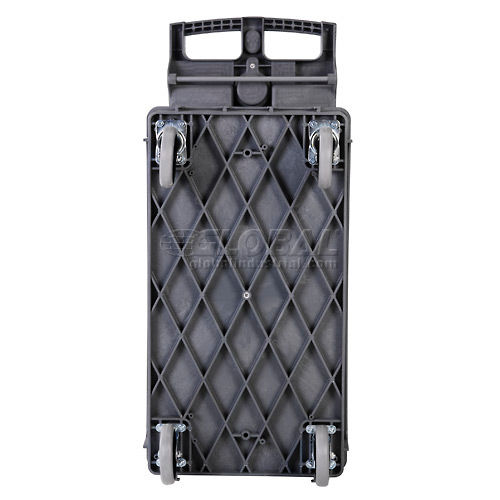 Versatile cart offers molded-in tool storage trays, cup-holder and towel rack conveniently located in the ergonomically designed push handle. Heavy duty, tough structural foam plastic construction resists scratches, dents and cleans easily. 3" deep trays help to retain cargo during transit. Lightweight, quiet rolling cart maneuvers easily on 2 swivel, 2 rigid 5" rubber casters. Assembles easily. Personalize your plastic utility service cart with our great accessories. 1 Year Limited Warranty.
