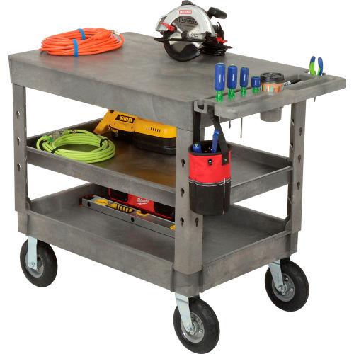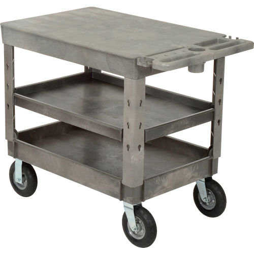 Make your move with this Industrial Strength plastic stock and utility cart. This high quality cart is virtually maintenance free and perfect for industrial, commercial, medical, or food service applications. Easy-to-clean structural plastic cart won't rust, dent, peel, or chip. Cart features smooth flat top shelf for work surface or easy loading/unloading of oversized cargo and 2-5/8" middle and bottom, leak-proof tray shelves with 2 swivel and 2 rigid non-marking 8" pneumatic wheels provide a smooth ride over rough surfaces. Comfort grip push handle for effortless steering. 1 Year Limited Warranty. Cart Features: Molded-in tablet holderDrill/Cup holderStorage tray(4) Screw driver holders(2) Tool/Bag hooks on left and right ends of the handle Support legs offer 4" spaced slots on each side of the legs to hold specialized accessories to increase your productivity. Choose from hooks, spool holders or utility bins, ladder holders and power strips all designed to improve the functionality of these carts, sold separately. 500 lb. capacity; 250 lb. per shelf evenly distributed, not to exceed overall cart capacity. Easy assembly. New and improved design replaces previous Model 241589.