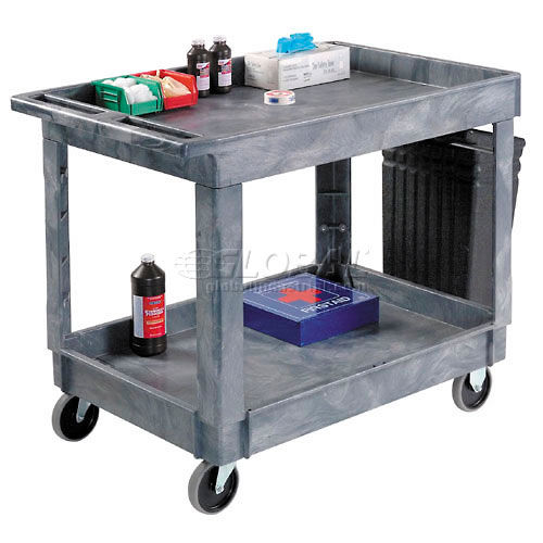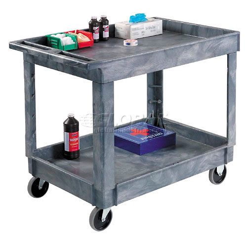 Plastic 2 Shelf Tray Service & Utility Cart 40x26, 5" Rubber Casters - 498526 Make your move with this lightweight, rugged plastic stock and utility cart that's virtually maintenance free and perfect for industrial, medical, or food service loads. Easy-to-clean structural plastic cart won't rust, dent, peel, or chip. Cart features a 3" deep, leak-proof top tray, 2 non-marking swivel casters in front, 2 fixed casters in back, and comfort grip push handle for effortless steering. Personalize your plastic utility service cart with our great accessories. Easy assembly.