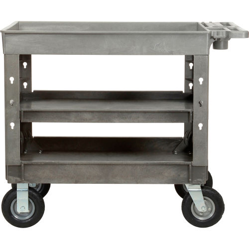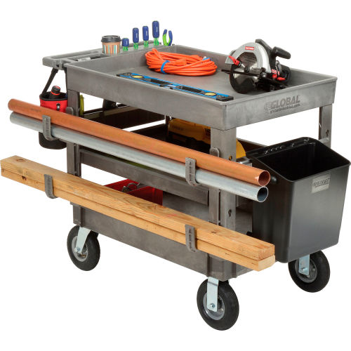 Make your move with this Industrial Strength plastic stock and utility cart. This high quality cart is virtually maintenance free and perfect for industrial, commercial, medical, or food service applications. Easy-to-clean structural plastic cart won't rust, dent, peel, or chip. Cart features 2-5/8" deep, leak-proof shelf trays with 2 swivel and 2 rigid non-marking 8" pneumatic wheels that provide a smooth ride over rough surfaces. Comfort grip push handle for effortless steering. 1 Year Limited Warranty. Cart Features: Tablet/Cell Phone holderDrill/Cup holderStorage tray(4) Screw driver holders(2) Tool/Bag hooks on left and right ends of the handle36" L x 24" W shelves Support legs offer 4" spaced slots on each side of the legs to hold specialized accessories to increase your productivity. Choose from hooks, spool holders or utility/trash bins, ladder holders and power strips all designed to improve the functionality of these carts, sold separately. 500 lb. capacity; 250 lb. per shelf evenly distributed not to exceed overall capacity. Easy assembly. New and improved design replaces previous Model 241567.