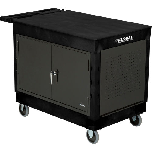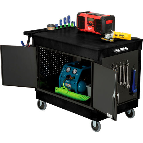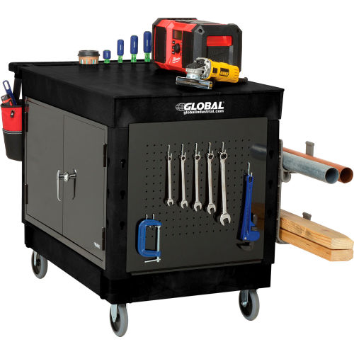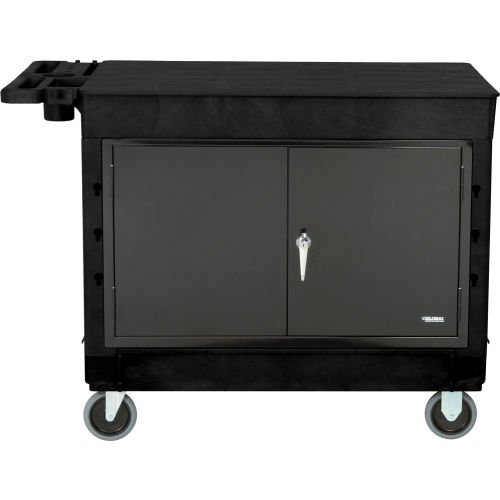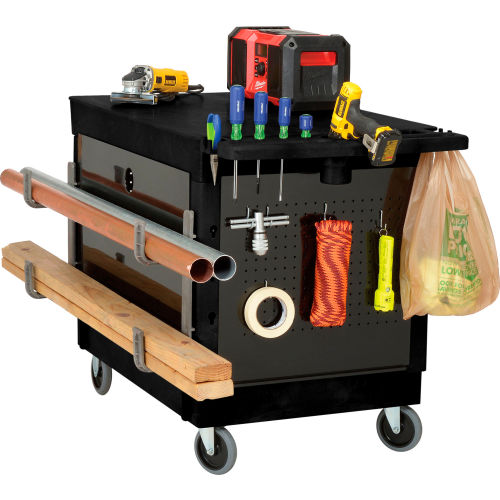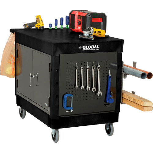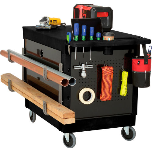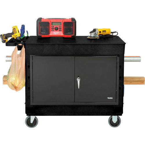Rugged Industrial Strength plastic stock and utility cart has steel locking doors and sides with steel pegboard at both ends for secure storage and organization. Cable management opening on back allows cart to be used as a mobile charging station for rechargeable tools. Pegboard end panel prevents heat build-up from electronics. Steel enclosure secures valuables with 2 point locking mechanism that captures and locks both doors. Locking chrome door handle includes 2 keys. Perforated end panels serve as a pegboard with handy organization hooks (sold separately). This high quality cart is virtually maintenance free and perfect for industrial, commercial or office applications. Easy-to-clean structural plastic cart won't rust, dent, peel, or chip. Cart features smooth flat top shelf for worksurface or easy loading/unloading of oversized cargo and a 2-5/8" bottom, leak-proof shelf trays with 2 swivel and 2 rigid non-marking 5" rubber casters. Comfort grip push handle for effortless steering.Color finish: Black Cart Features: Molded-in tablet holderDrill/Cup holderStorage tray(4) Screw driver holders(2) Tool/Bag hooks on left and right ends of the handle Support legs offer 4" spaced slots on each side of the legs to hold specialized accessories to increase your productivity. Choose from hooks, spool holders or utility bins, ladder holders and power strips all designed to improve the functionality of these carts, sold separately. 500lb capacity; 250lb per shelf evenly distributed. Easy assembly.