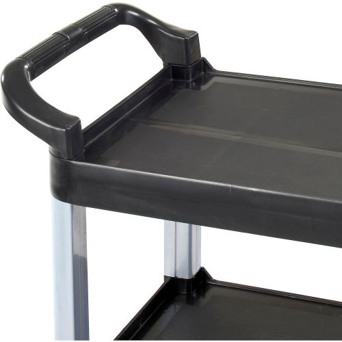 This serving cart can be used in restaurants, cafeterias, offices or any environment that requires a functional and easy to clean cart; ideal for food service applications. Durable polypropylene plastic construction resists scratches, chips and dents. Lightweight aluminum uprights provide strength and rigidity. All shelves feature a 1" lip on three sides to help retain cargo during transport. Comfortable push handles offer easy steering. Rolls easily on non-marring PVC swivel casters. Assembles easily. Lifetime Limited Warranty!.
