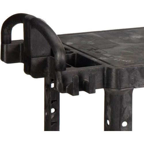 Heavy-duty structural foam plastic construction makes this cart tough enough for long, rugged use. Handles a wide variety of order picking and material handling needs in factories, hospitals and labs. Virtually maintenance free, as it won't rust, chip or dent, and is easily cleaned. Comfortable, taller ergonomic handle features storage bins for supplies and accessories. Side tool hooks allow hammers and cords to be carried to the job. Cart legs offer holes for adding customized spool and roll holders. Flat Top Shelf Cart works best when unloading/loading oversized items and a perimeter channel retains smaller items. Lightweight cart rolls easily on 2 swivel, 2 rigid non-marking casters. Assembles easily. 1 Year Limited Warranty. Options Include: locking steel drawer to help protect valuables and a 3-outlet surge protected power strip with 10' cord (UL listed).