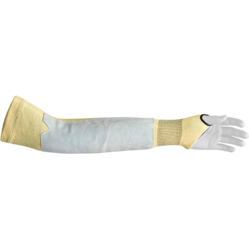 Features 360 degree FiberWire cut level A5 with a gauge shell: Aramid-blend fibers, Fire resistant to ANSI standard A3, 18" forearm length with an adjustable closure for a secure fit, Thumb loop keeps sleeve securely in place, Sold as a pair.