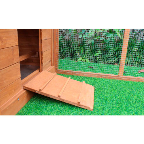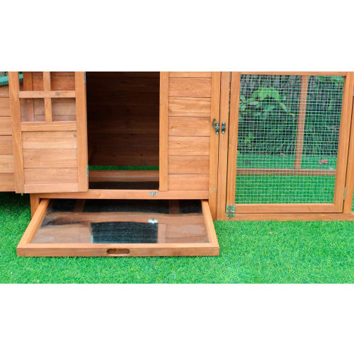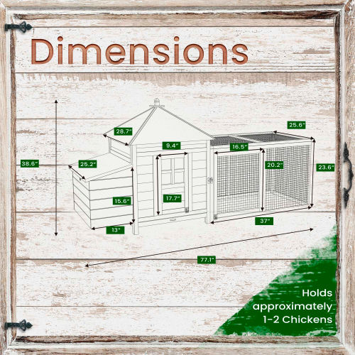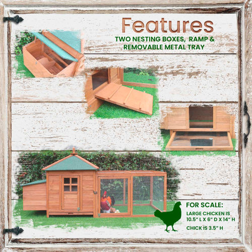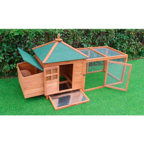 Care for your feathered friends in style with this spacious Wooden Chicken Coop from Hanover. The future home of your poultry includes two perches, two nesting boxes, chicken run, removable metal tray and a wooden ramp. It provides access to both shade and sunlight with its indoor and outdoor areas, space to lay eggs in nesting boxes and perches for roosting. Designed with the health and safety of your animals in mind, this coop features a latching system on the doors and access points, waterproof asphalt roof and sturdy, solid wood construction. The heavy duty mesh wire surrounding the exterior of the chicken pen provides both protection and a supply of fresh air to keep your chickens happy and healthy. Please note, a floor is not included with the chicken coop, so if predators digging under the pen in a concern, we encourage you to take added precautions for the safety of your birds. Cleaning is made easy with the slide out metal tray and convenient access to the interior space through the doors. With Hanover, you'll be able to provide your animals a quality environment to thrive in. Features: Wooden Chicken Coop includes: 2 nesting boxes, 2 perches, chicken run, removable pullout metal tray, and ramp.Coop includes a latching system for both (2) doors and access point above nesting boxes to keep your animals secure.Cleaning is simple with convenient pull out metal tray and easy entry into the covered spaces.Wooden ramp connects indoor and outdoor spaces.Provides access to shade and sunlight with excellent ventilation.Sturdy, solid fir wood construction with cedar red finish.Green asphalt roof is water proof.Collecting eggs is easy thanks to the latched access point over the nesting boxes.Can comfortably house 1-2 chickens depending on animal size.Assembled dimensions: 3.2 ft. H x 6.4 ft. W x 2.4 ft. D.Nesting box area size: 15.5 in. H x 13 in. W x 24.5 in. D.Number of perches: 2.Number of nesting boxes: 2.Care: Wipe clean with a dry cloth.Made with non-toxic materials.1 year limited warranty.