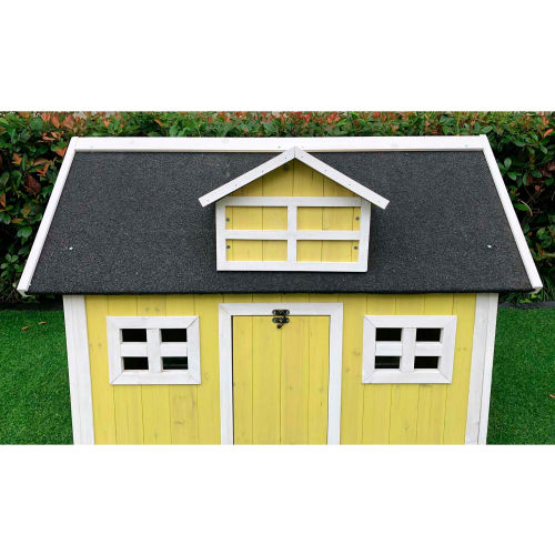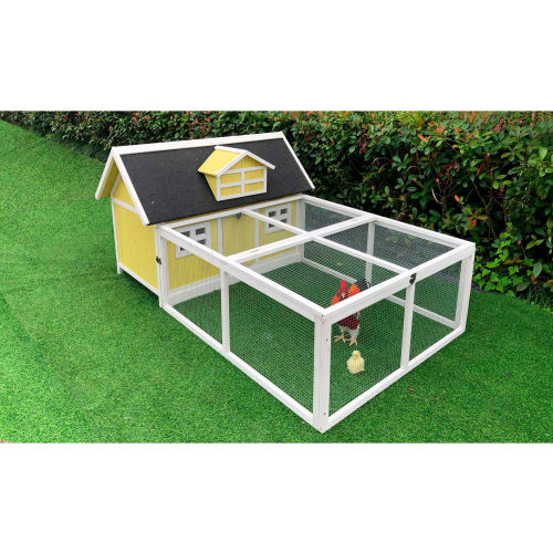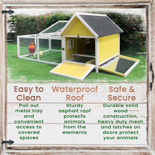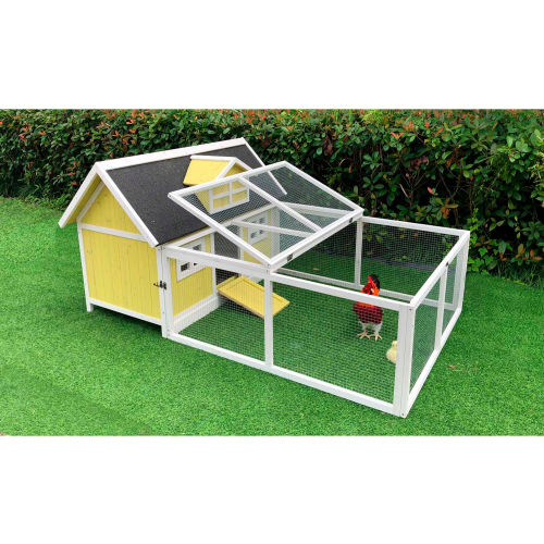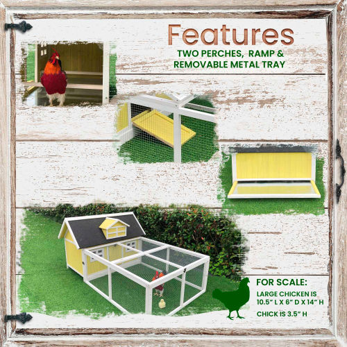 Care for your feathered friends in style with this spacious Wooden Chicken Coop from Hanover. The future home of your poultry includes two perches, large chicken run, removable metal tray and wooden ramp. Designed with the health and safety of your animals in mind, this coop features a latching system on the doors, waterproof asphalt roof and sturdy, solid wood construction. The heavy duty mesh wire surrounding the exterior of the chicken pen provides both protection and a supply of fresh air to keep your chickens happy and healthy. Please note, a floor is not included with the chicken coop, so if predators digging under the pen in a concern, we encourage you to take added precautions for the safety of your birds. Cleaning is made easy with the slide out metal tray and convenient access to the interior space through the doors. With Hanover, you'll be able to provide your animals a quality environment to thrive in. Features: Wooden Chicken Coop includes: ramp, large wire mesh run, waterproof roof, and removable trayCoop includes a latching system for all 3 doors to keep your animals secureCleaning is simple with convenient removable metal tray and easy entry into the covered spacesProvides access to shade and sunlight with excellent ventilationHeavy duty mesh enclosure provides excellent ventilation and protection from predatorsSturdy, solid fir wood construction, painted yellow with white accentsBlack asphalt roof is water proof Can comfortably house up to 3 chickens depending on animal sizeAssembled dimensions: 2.8 Ft. x 5.9 Ft. x 3.8 Ft. Coop has 3 doors and 2 windowsNumber of perches: 2Care: Wipe clean with a dry clothMade with non-toxic materials1 year limited warranty.