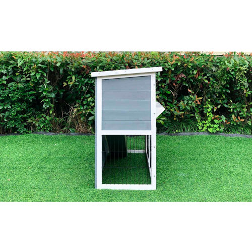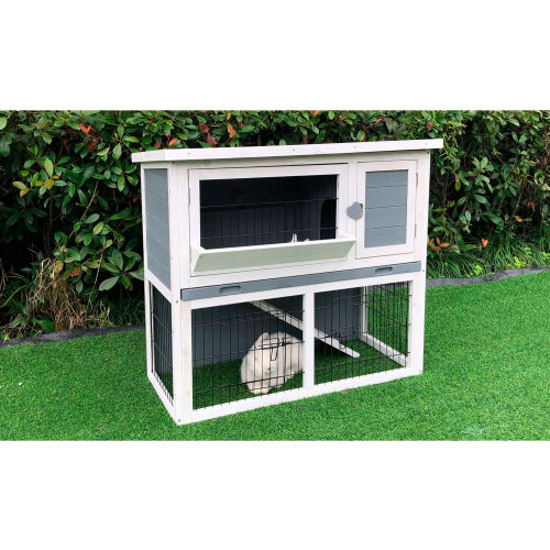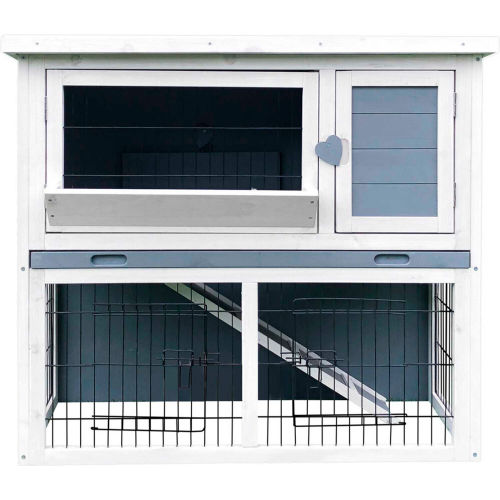 House your furry friends in style with this spacious Wooden Rabbit Hutch from Hanover. The two-level hutch includes wire mesh run, waterproof roof, wooden ramp and removable metal tray. It's the perfect hideaway for rabbits, guinea pigs, chinchillas or other similarly sized animals. The upper level provides a cozy sanctuary for your pets to rest while the lower level is a mesh run. Designed with the health and safety of your animals in mind, this hutch features latches on the lower doors and a cute heart-shaped toggle to secure the upper doors, a waterproof asphalt roof and non-toxic, solid wood construction. The heavy duty mesh wire that surrounds the exterior provides both protection and a supply of fresh air to keep your bunnies happy and healthy. Please note, a floor is not included for the wire mesh run area, but there is a door between the upper and lower levels that can be closed to secure your animals inside. Cleaning is made easy with the slide out metal tray and convenient access to the interior spaces through the doors and roof. With Hanover, you can provide your animals a quality environment to thrive in. Features: Wooden Rabbit Hutch includes: wooden ramp, wire mesh run, waterproof roof, and removable trayFor security, the hutch has latches on lower doors and wooden toggle latch for upper doorsConvenient pull out metal tray, roof access and multiple doors make cleaning easyWooden ramp connects upper and lower levelsWire mesh provides protection and excellent ventilationSturdy, solid fir wood construction with gray and white finishBlack asphalt roof is waterproofCan comfortably house 1-2 rabbits or similarly sized small animals depending on animal sizeAssembled dimensions: 3 ft. W x 1.5 ft. D x 2.6 ft. HMade with non-toxic materials1 year limited warranty.