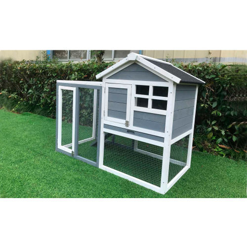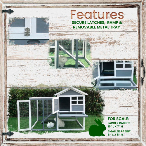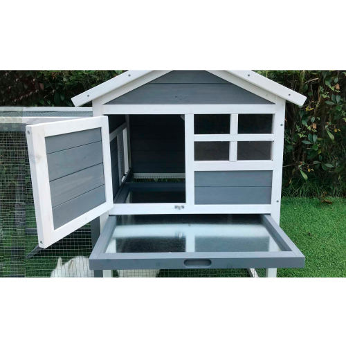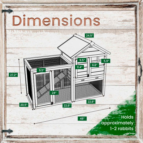 House your furry friends in style with this spacious Wooden Rabbit Hutch from Hanover. The two-level hutch includes wire mesh run, waterproof roof, ramp and removable metal tray. It's the perfect hideaway for rabbits, guinea pigs, chinchillas or other similarly sized animals. The enclosed upper level provides a cozy sanctuary for your pets to rest while the lower level is a mesh run that provides access to shade and sun. Designed with the health and safety of your animals in mind, this hutch features latches on the two doors, a waterproof asphalt roof and non-toxic, solid wood construction. The heavy duty mesh wire that surrounds the exterior provides both protection and a supply of fresh air to keep your bunnies happy and healthy. Please note, a floor is not included for the wire mesh run area. Cleaning is made easy with the slide out metal tray and convenient access to the interior spaces through the two large doors. With Hanover, you can provide your animals a quality environment to thrive in. Features: Wooden Rabbit Hutch includes: wooden ramp, wire mesh run, waterproof roof, and removable trayFor security, the hutch has latches on both doorsCleaning is simple with convenient pull out metal tray and easy entry into the enclosed spacesWooden ramp connects upper and lower levelsProvides access to shade and sunlight with excellent ventilationSturdy, solid fir wood construction with gray and white finishBlack asphalt roof is waterproofCan comfortably house 1-2 rabbits or similarly sized small animals depending on animal sizeAssembled dimensions: 4 ft. W x 2 ft. D x 3 ft. HMade with non-toxic materials1 year limited warranty.