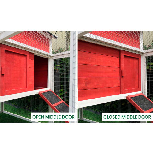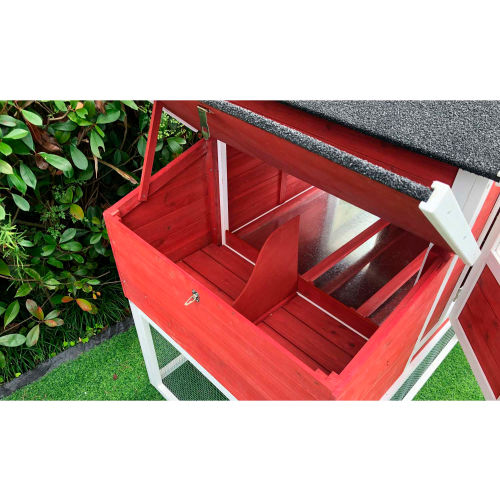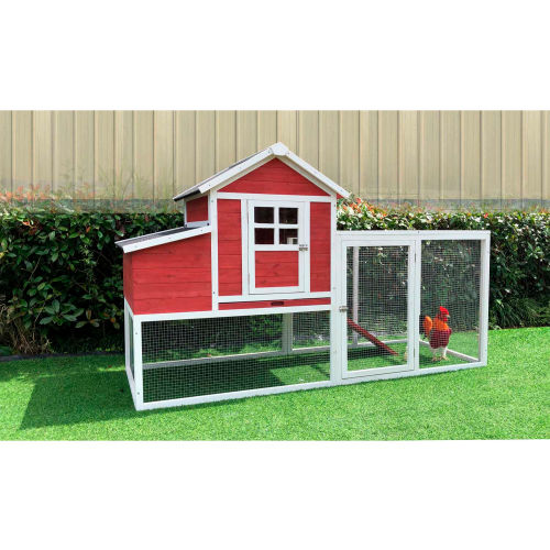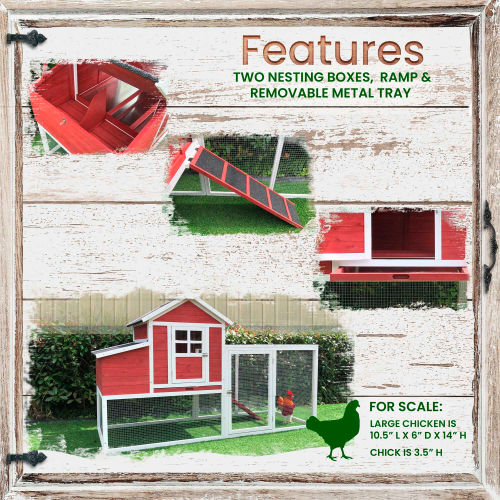 Care for your feathered friends in style with this spacious Elevated Wood Chicken Coop from Hanover. The future home of your poultry includes an upstairs indoor shelter with a ramp leading down to an enclosed chicken run below. The chicken run provides access to both shade and sunlight, while the interior space has room to lay eggs in the two nesting boxes and two perches for roosting. Designed with the health and safety of your animals in mind, this coop features a latches on the two doors, waterproof asphalt roof and sturdy, solid wood construction. The heavy duty mesh wire surrounding the exterior of the chicken pen provides both protection and a supply of fresh air to keep your chickens happy and healthy. Please note, a floor is not included with the chicken coop, so if predators digging under the pen in a concern, we encourage you to take added precautions for the safety of your birds. Cleaning is made easy with the slide out metal tray and convenient access to the interior space through the doors. With Hanover, you'll be able to provide your animals a quality environment to thrive in. Features: Elevated Wooden Chicken Coop includes: 2 nesting boxes, 2 perches, chicken run, removable pullout metal tray, rampCoop includes a latching system for both (2) doors and nesting box area to keep your animals secureCollecting eggs is easy thanks to the latched access point over the nesting boxesCleaning is simple with convenient removable metal tray and easy entry into the covered spacesWooden no-slip ramp connects the upper and lower levelHeavy duty mesh enclosure provides excellent ventilation and protection from predatorsDurable fir wood construction, painted red with white accentsBlack asphalt roof is water proofCan comfortably house up to 3 chickens depending on animal sizeAssembled dimensions: 3.9 Ft. x 6.5 Ft. x 2.6 Ft.Number of nesting boxes: 2Nesting box area size: 10.8 in. H x 13.4 in. W x 29.9 in. DNumber of perches: 2Care: Wipe clean with a dry clothMade with non-toxic materials1 year limited warranty.