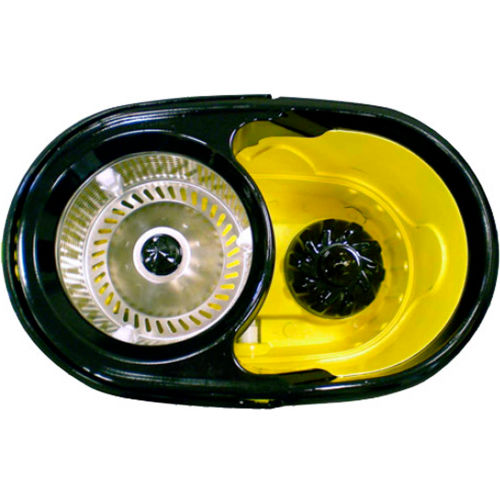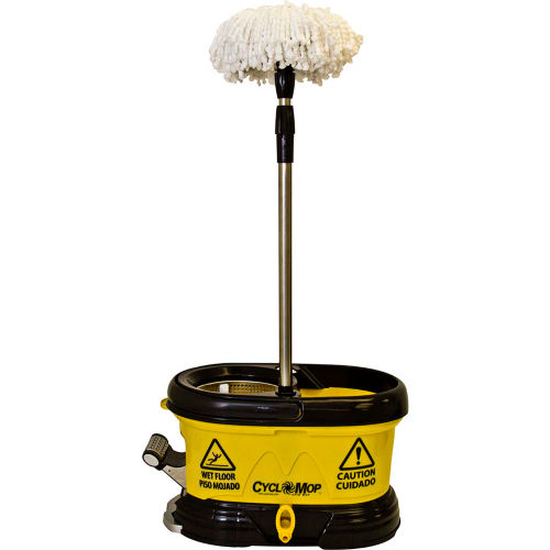 Hurricone Cyclomop 500 Series w/ Dolly - CM500D Cycomop is a 360 rotating spin mop that will quickly and effectively clean up dirt, dust, and other spills from marble, tile, laminate, vinyl, wood floors and hard surfaces, cutting the cleaning and drying process in half. The microfiber head is ultra absorbent and reusable, while the bucket is designed with a fast-spinning stainless steel wringer which can be activated by the non-slip TPR grip foot pedal or simply pumping up and down the mop handle. Features stainless steel mop head attachment and a longer 56" mop handle with rotating hand grip. Cyclomop w/Dolly includes: Cyclomop Bucket, Dolly with 2-1/2" Wheels, Mop Handle, 2 Microfiber Mop Heads and a Nylon Scrub Brush.