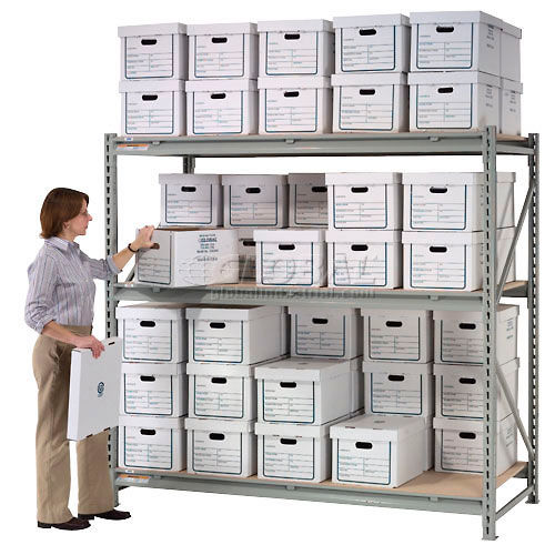 HEAVY LOAD RECORD STORAGE CENTER 36"D Starter Center Heavy duty shelving with file boxes makes organized record storage affordable and convenient. High capacity steel racks, with up to 2150 lb. capacity per level, handle the biggest record storage needs. Made using boltless 12-gauge steel horizontal beams with 3-hook connector end plates that allow easy installation without tools. Beams adjust in seconds at 1-1/2" increments. Uprights are 14-gauge steel. Rack is finished in gray powder coating. Rugged 200 test corrugated transfer file boxes protect and organize records for storage with double-thick front and back walls, large label area and hand holes for easy lifting and portability of stored records. Boxes fit securely on rugged 5/8" thick particleboard decks. 36"D Unit stores 2 rows with access from both sides and include 5 additional supports per level to handle any record storage job. Easy assembly.