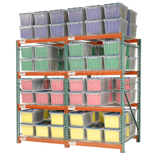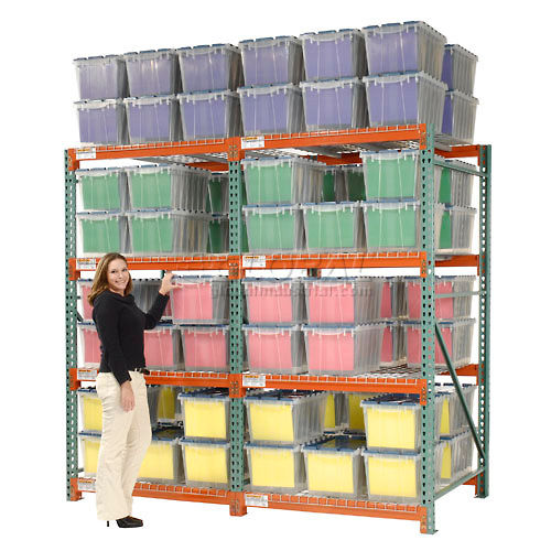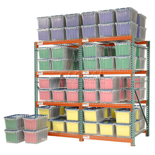 EXTRA HEAVY DUTY RECORD STORAGE Add-On Unit - 21-1/2"L x 15"W x 12-1/2"H Polyethylene Boxes Included These record storage systems feature Global's pallet rack design to provide the highest capacities for the lowest prices. Global Record Storage Units offer quick and easy, tool free assembly for all your document storage needs. File storage racks are made of durable heavy gauge steel for years of dependable service. Heavy duty one-piece, box formed 13 gauge steel uprights allow easy beam installation. 3-1/4" x 4-1/4" x 12 gauge welded base plates allow floor anchoring. Beams feature a positive 6-way locking action that automatically secures beam into place. Welded braces provide maximum rigidity and stability for your record storage system. Dust free wire mesh decking helps store document boxes on front and back for two rows of storage; allows access to either side. Long lasting epoxy finish. Polyethylene Boxes are made with transparent high density polypropylene with reinforced ribs and a padlockable hinged lid. Includes metal hang rails for letter and legal filing. Easy assembly.