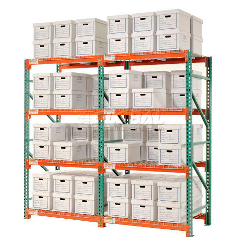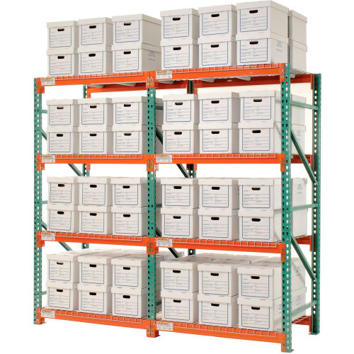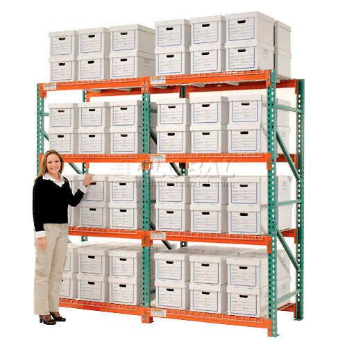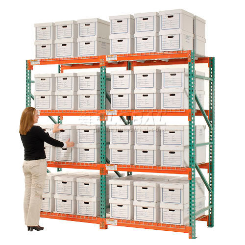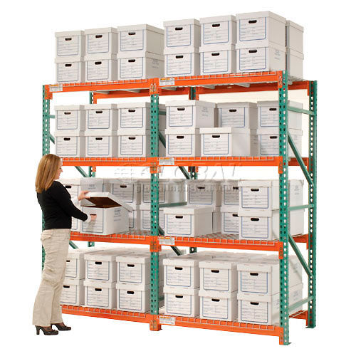 EXTRA HEAVY DUTY RECORD STORAGE Add-On Unit - 15"L x 12"W x 10"H Corrugated Boxes Included These record storage systems feature Global's pallet rack design to provide the highest capacities for the lowest prices. Global Record Storage Units offer quick and easy, tool free assembly for all your document storage needs. File storage racks are made of durable heavy gauge steel for years of dependable service. Heavy duty one-piece, box formed 13 gauge steel uprights allow easy beam installation. 3-1/4" x 4-1/4" x 12 gauge welded base plates allow floor anchoring. Beams feature a positive 6-way locking action that automatically secures beam into place. Welded braces provide maximum rigidity and stability for your record storage system. Dust free wire mesh decking helps store document boxes on front and back for two rows of storage; allows access to either side. Long lasting epoxy finish. Corrugated Boxes are made with 6590 lb. test corrugated cardboard and include a lid to protect contents. 15"L Boxes are designed to hold letter and legal size records. Easy assembly.