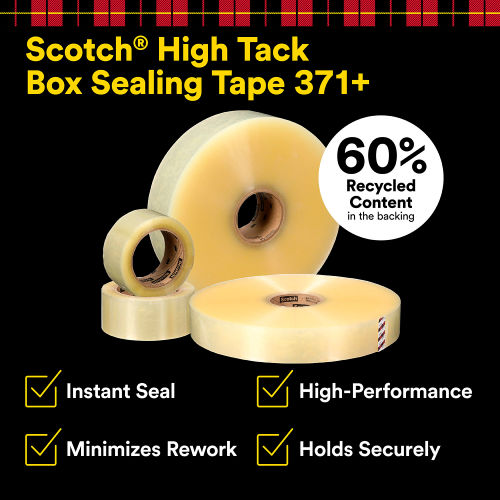 Scotch High Tack Box Sealing Tape 371+ is an industrial grade packing tape that securely closes a wide variety of medium weight box materials, including recycled fiberboard. The polypropylene film backing is easy to unwind and resists abrasion, moisture and scuffing. The backing easily conforms around edges and on rough surfaces for a tight seal. Features: Industrial performance packaging tape for medium-duty industrial applicationsMeets FDA guidelines for indirect food contactAdheres to a wide range of materials including corrugated boxes with 100% recycled contentTamper evident seal with the highest strength and durability in tough environmentsIndustrial packaging tape for medium-duty applicationsHigh edge tear and split resistance ideal for general industrial applicationsPolypropylene backing with synthetic rubber adhesive delivers conformability under stressEasy unwind and smooth dispensing works well on high-speed automated packaging linesResists abrasion, moisture, chemicals and scuffing for long-lasting performanceCan be custom printed for brand promotion - Pkg Qty 24.