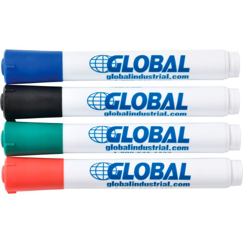 Global Industrial Dry Erase Marker Set - Pack of 5 Makers (4 colors per Pack). Our dry erase markers work great on white board, glass and any other non-porous surface. The ink is easily removed with a dry cloth, tissue or eraser. Low odor, non-toxic, dry erase inks will not irritate your eyes or nose. Four assorted colors per pack - Black, Red, Blue and Green.