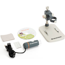 The Celestron Handheld Digital Microscope Pro is an easy to use, low-power microscope with a 5.0 MP sensor for capturing photos and video of your discoveries. At low magnification, the Handheld Digital Microscope Pro is ideal for viewing stamps, coins, bugs, plants, rocks, skin, gems, circuit boards, and more. You can even view traditional slides at high magnification. Create high-resolution images, VGA quality video, and time-lapse animations using the included Micro Capture Pro software. You can also take accurate measurements and make notes on your specimens using this intuitive software. An adjustable LED illuminator ensures your specimens are clear and bright, while the fully adjustable, professional stand allows for steady shots even at high magnification. Features: Intended for the discriminating hobbyist or professional, the Handheld Digital Microscope Pro is well suited for jobs such as entomology, industrial quality control, component inspection, medical investigation, scientific research, and forensics documentationjust to name a few. True 5MP sensor to capture and save high-resolution images and videos of your specimens5-Element IR cut high-quality glass lens ensures sharper images20x to 200x powers, great for low-power observation of 3D specimens (Note: Final magnification determined by monitor size)Professional, adjustable height stand included for hands-free operation4 foot USB 2.0 cable for easy maneuverability when viewing large surfacesDownloadable MicroCapture Pro software available for both Mac and Windows PCs.