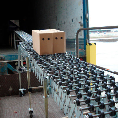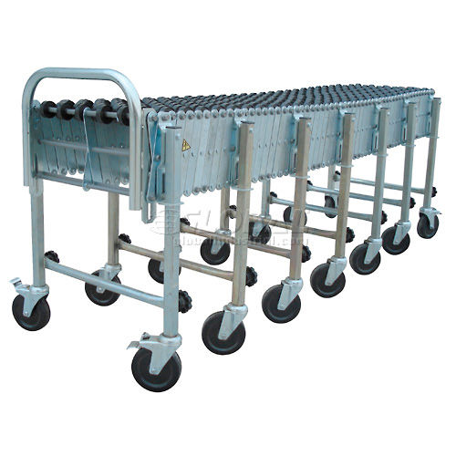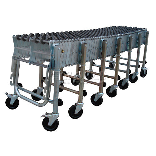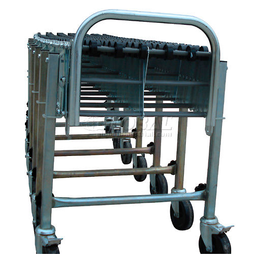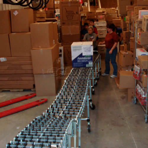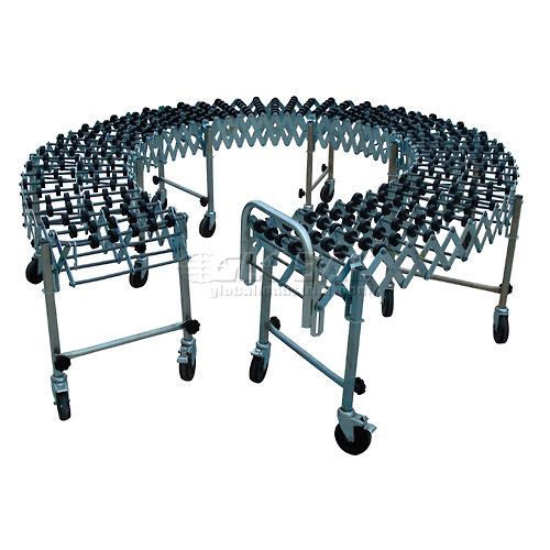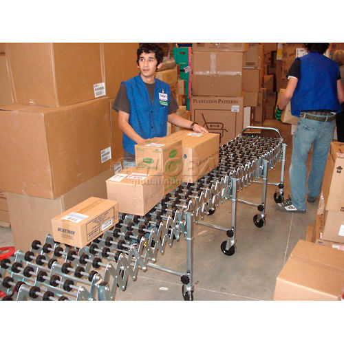 NestaFlex PORTABLE FLEXIBLE CONVEYOR Flexible and expandable portable gravity conveyor is ideal for shipping, receiving, assembly and packaging stations. Reduces to 25% of expanded length for compact storage. Self-tracking Skate Wheel Conveyor offers smooth movement of multi-size material. Black polymer wheels have 7 steel ball bearings in a captive race. 5-1/4" axle centers for minimum package size. Zinc plated 12 gauge steel legs and 5/16" dia. steel axles. Box stop and 2 hook couplers included. Telescopic legs adjust from 28" to 44" high. 5" x 1-1/2" swivel casters, with brakes on end legs, for easy transport. All units bend around a 12" radius. 18 Month Limited Warranty.