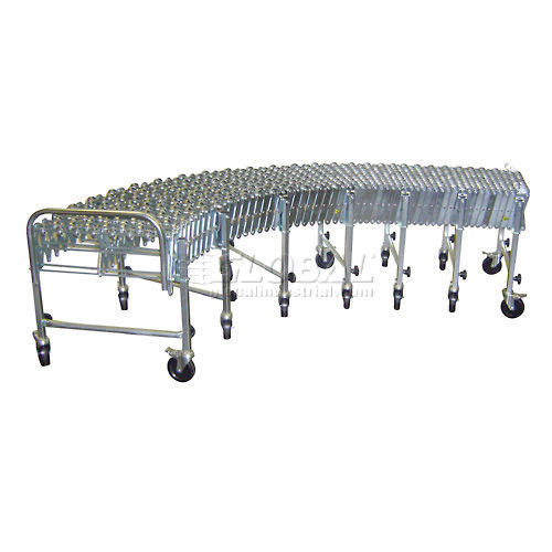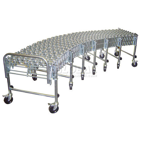 NestaFlex PORTABLE FLEXIBLE CONVEYOR Flexible and expandable portable gravity conveyor is ideal for shipping, receiving, assembly and packaging stations. Reduces to 25% of expanded length for compact storage. Self-tracking Skate Wheel Conveyor offers smooth movement of multi-size material. Steel skate wheels have 8 steel ball bearings in a captive race. 5-1/4" axle centers for 11" minimum package size. Zinc plated 12 gauge steel legs and 5/16" dia. steel axles. Box stop and 2 hook couplers included. Telescopic legs adjust from 28" to 44" high. 5" x 1-1/2" swivel casters, with brakes on end legs, for easy transport. All units bend around a 12" radius. 18 Month Limited Warranty.