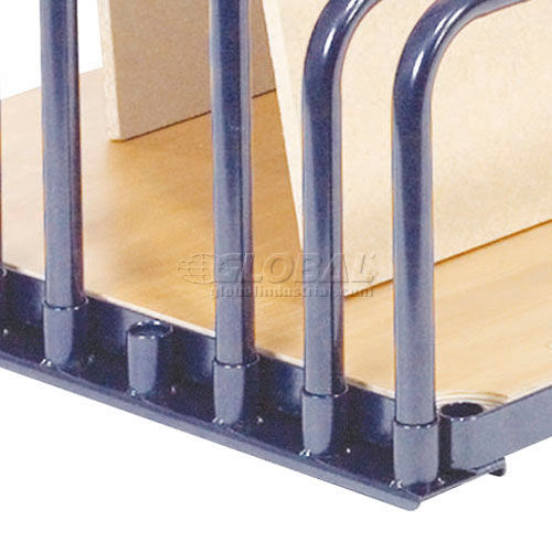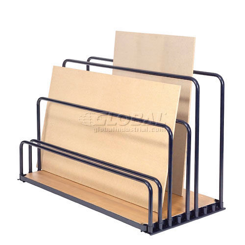 Adjustable Sheet Rack Stores and displays sheet materials such as drywall, plywood and paneling and permits easy viewing and access. Includes 3 pairs of 1-3/16" diameter steel pipe uprights at 12", 26" and 36" heights mounted over a steel framed wooden deck. Frame construction is 1-1/2"H x 3/4" thick angle iron with rounded safety edges, provisions for floor mounting and a blue enamel finish. This frame includes 7 sockets that permit uprights to be adjusted at 3-1/2" increments.