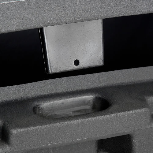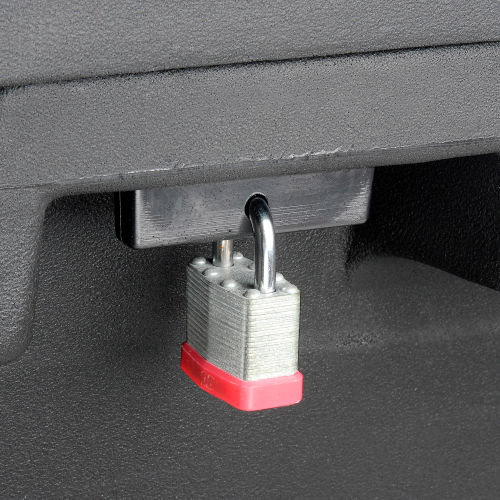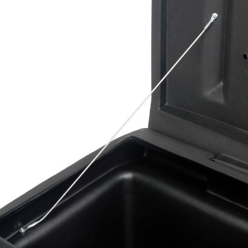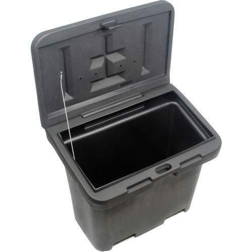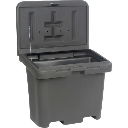 POLY SALT BOX Plastic Container Is Ideal For Storing Salt In Cold, Winter Conditions. Outdoor storage container offers an 8.8 cubic foot capacity. Durable, corrosion resistant poly plastic with double panel, sloped lid that is padlockable for security (lock sold separately). Lid is sloped to reduce snow and rain build-up. Stainless steel hinge for strength. Includes hand holds for ease of carrying when empty and 2-way fork access for transport when full. Measures 36"W x 24"D x 34"H overall.