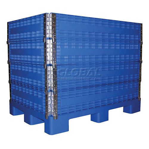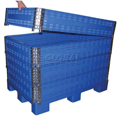 MULTI-HEIGHT CONTAINER This Bulk Container features height attachments to fit various applications. Height adjustable bulk container includes one pallet base and four side attachments for added height. Each height attachment adds 7-7/8" usable height. Height attachments fold when not in use; measures 74-1/2"L x 8-3/4"W x 2-3/4"D when folded. Made from corrosion resistant polyethylene with steel corner hinges. 2,500 lb. capacity. Base allows 4-way forklift access and measures 5-7/8"H. Measures 47-3/16"L x 31-3/8"W x 37-1/2"H overall.