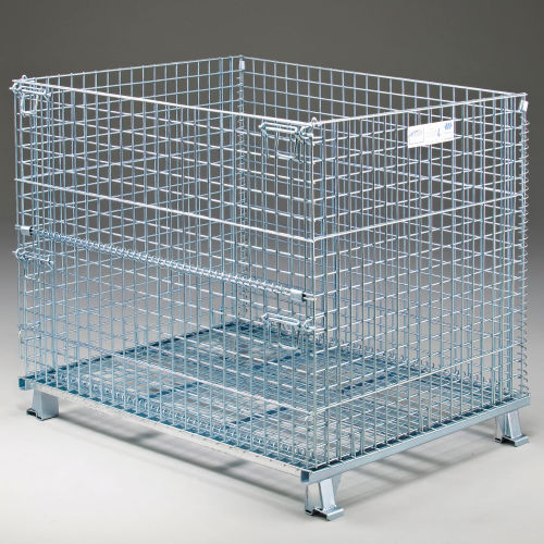 FOLDING WIRE CONTAINERS 3,000-4,000 Lb. Capacity Container 2" Square Mesh Openings Folding wire containers efficiently maximize any storage space. These wire containers are collapsible to set up in seconds and fold flat to save space and reduce return shipping costs. Open wire mesh provides excellent visibility for easy inventory control. Wire storage containers help eliminate dust and dirt build up. Notched, positive stacking legs permit handling by forklift or pallet truck. Drop gate allows access to contents, even when stacked. Corrosion resistant zinc-plated finish. This container will collapse to roughly 9".