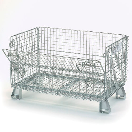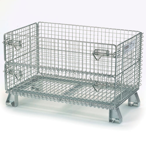 FOLDING WIRE CONTAINERS 1,000 Lb. Capacity Container 1/2" Square Mesh Openings Folding wire containers efficiently maximize any storage space. These wire containers are collapsible to set up in seconds and fold flat to save space and reduce return shipping costs. Open wire mesh provides excellent visibility for easy inventory control. Wire storage containers help eliminate dust and dirt build up. Notched, positive stacking legs permit handling by forklift or pallet truck. Drop gate allows access to contents, even when stacked. Corrosion resistant zinc-plated finish.