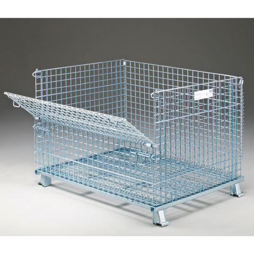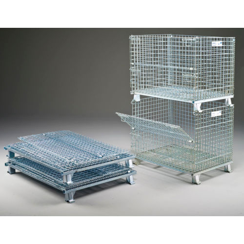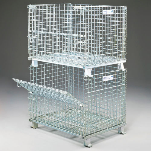 FOLDING WIRE CONTAINERS 3,000-4,000 Lb. Capacity Container 2" Square Mesh Openings Folding wire containers efficiently maximize any storage space. These wire containers are collapsible to set up in seconds and fold flat to save space and reduce return shipping costs. Open wire mesh provides excellent visibility for easy inventory control. Wire storage containers help eliminate dust and dirt build up. Notched, positive stacking legs permit handling by forklift or pallet truck. Drop gate allows access to contents, even when stacked. Corrosion resistant zinc-plated finish.
