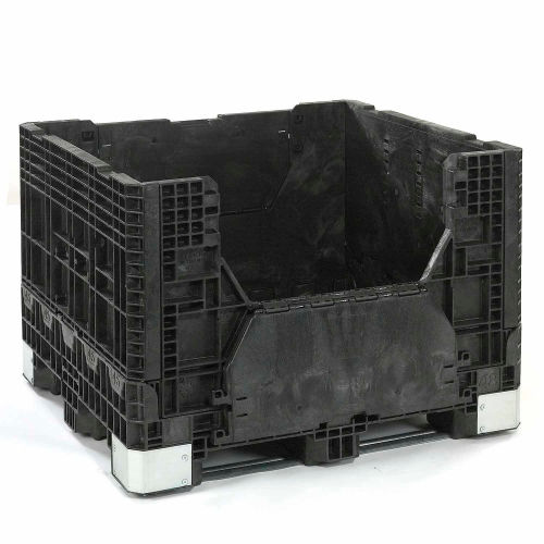 Steel Reinforced Buckhorn Folding Bulk Containers Industrial grade polymer structural foam resist oils, chemicals and moisture and provides a smooth, easy-to-clean interior. 2 hopper gates are included on the longest sides for easy access, even when stacked. Interlocking side panel secure panels and doors for quick folding and setup. Equipped with steel corners guards and steel runners on bottom for protection from forklifts. Black color.