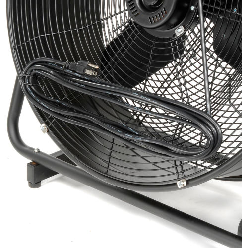 These industrial fans feature a quiet 2-speed motor with thermal cutoff for overheat protection. DBA rating 62 Low Speed / 69 at High Speed, DBA measured by using IEC 60704 Standard. Blower fans have a roller bearing motor that is heat resistant and maintenance-free. The sturdy steel housing of these portable floor fans have formed channels for enhanced rigidity, a grip handle for portability and a powder coat black finish. Grills have curved grid supports. 18'L 3-conductor power cord with plug. 120V. Features 3 blades. Fan tilts to direct airflow vertically and tightens in place with a screw knob. 5" rubber wheels. This product is designed to operate between 32-104 degrees Fahrenheit. UL, cUL Listed. Meets OSHA and UL507 Standards. Horsepower rating based upon maximum speed/load. This product has limited warranty of 1 year.
