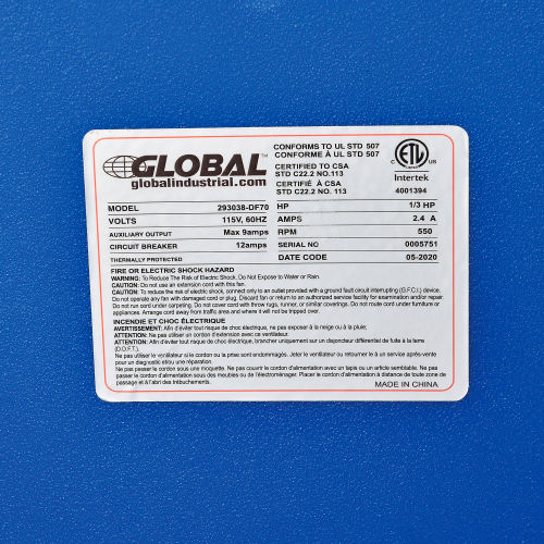 Global Industrial Blower Fan - Rotomold Plastic - Direct Drive - 6000 CFM - 1/3 HP.