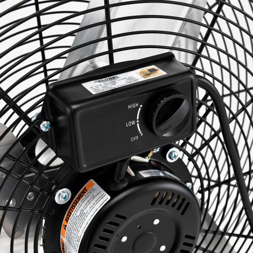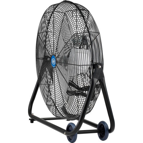 Easily move this blower/ floor fan where you need it. 24 Inch Diameter blower fan is powered by a 2-speed, 1/4 HP, 1.9 amp motor that provides 7,700 / 6,500 CFM. 3 aluminum fan blades are enclosed in wire safety guards with a black finish. Tubular steel frame features lift handles, non-marring floor glides for stability and 2 axle-mounted wheels for mobility. Blower fan includes 12'L, 120V 3-conductor power cord. UL, cUL Listed. Meets OSHA and UL 507 Standards. Horsepower rating based upon maximum speed/load. This product has limited warranty of 1 year.