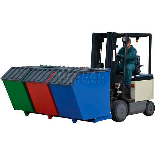 This unique hopper features three individual 46-"L x 24"W x 23-"H steel bins that are attached to a single forkliftable base, and each bin may be dumped independently. Bins are painted Green, Red and Blue for product identification and each bin holds up to cubic yard of material, 1-1/2 combined (maximum total weight capacity is 2000 lbs. evenly distributed). Self-dumping hoppers include manual pull cables to dump the bins from the seat of the forklift, and bins dump a full 90 and return to the upright position when lowered to the ground. Fork pockets are 22"L x 7"W x 2"H and hopper includes a safety strap to secure it to the forklift. Precise robotically welded steel construction is leak-inhibiting and features a durable powder coated finish for long life. NOTE: OSHA requires contacting the manufacturer of your fork truck for written approval for the use of any fork truck attachments.