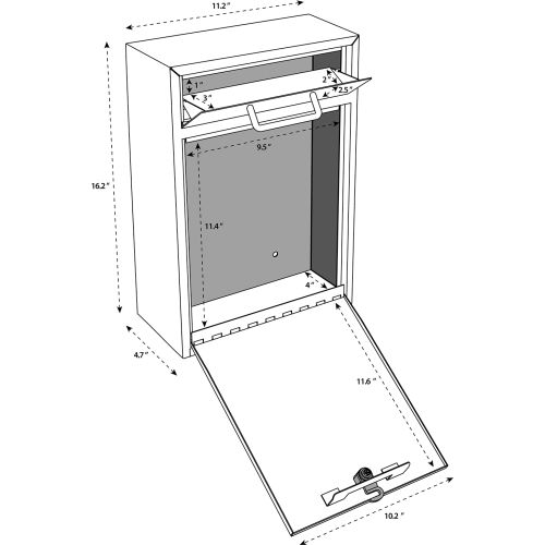 The Mail Boss Locking Security Drop Box drop is designed for ease of use to secure incoming office/residential mail, money, checks, keys, ballots, and more. Constructed of durable 16 gauge steel with a commercial grade 12 disc wafer lock and a patented anti-pry latch locking mechanism. Ideal for schools - private postal centers - corporate mail centers - restaurants - convenient stores - rental facilities - military bases - manufacturing plants. Features: Security wall mounted mailbox for convenient drop box applications including night drops, key drops, payment drops, interoffice mail and morePatented anti-pry latch locking mechanism featuring a chome-alloy tempered steel hook cam, commercial grade 12-disc wafer lock and (3) laser cut keysFeatures heavy duty 16-gauge galvanized steel construction with a powder-coated finish and an innovative bin door design to prevent fishingStainless steel hinges for durability and ease of useIncludes instructions with mounting template, installation hardware - 4 mounting screws, 4 stainless washers, driver bit and drill bit.
