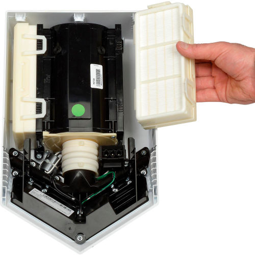 The new Dyson Airblade V hand dryer incorporates a reprogrammed 1000W digital motor and precision air apertures to make it 30% quieter than its predecessor when measuring loudness. Protruding just four inches from the wall, it complies with ADA guidelines without additional recessing costs. The Dyson Airblade V hand dryer uses touch-free operation and HEPA filtered air to dry hands hygienically in 12 seconds. Because of its reprogrammed motor, the new Dyson Airblade V dryer produces just 2.4g of CO2 per dry and costs $31 to operate per year. Warranty: 5 year parts, 5 year limited labor. Overall dimensions: 9-1/4"W x 4"D x 15-1/2"H.