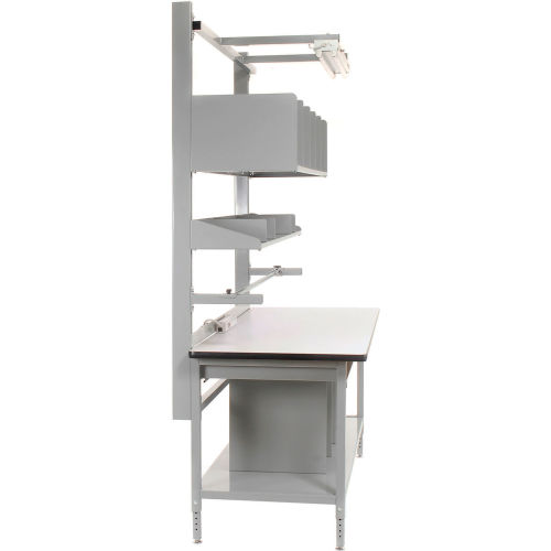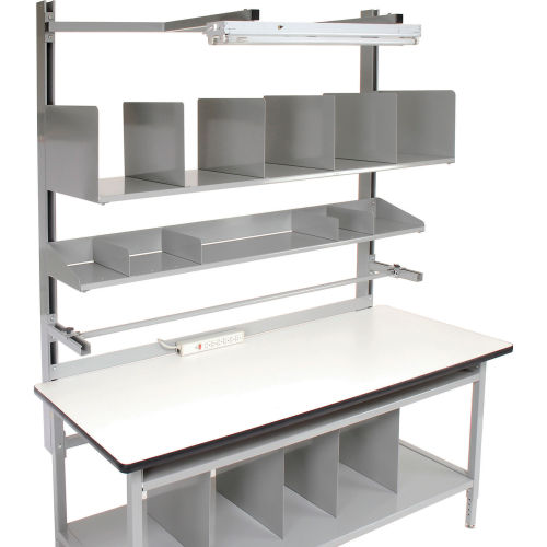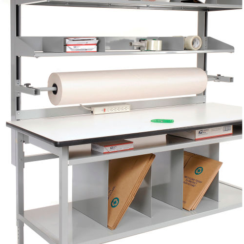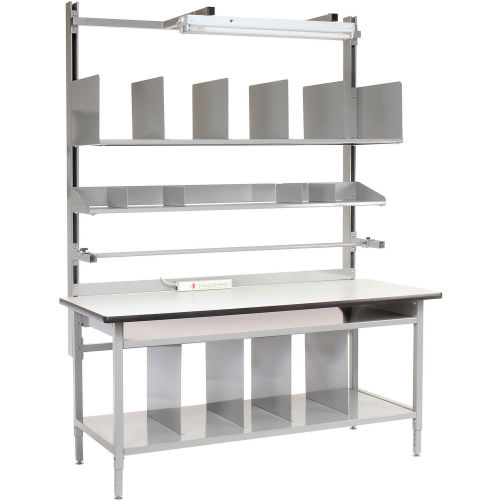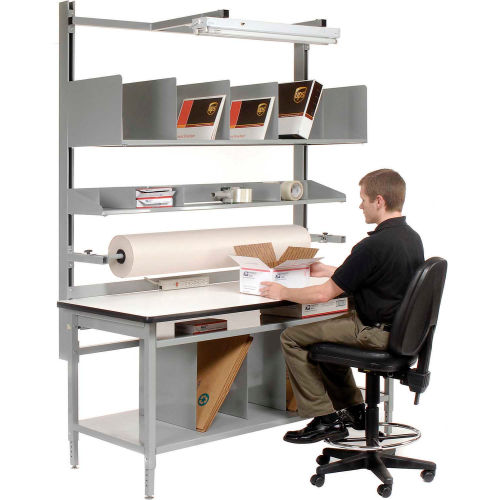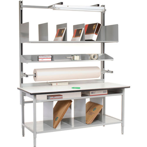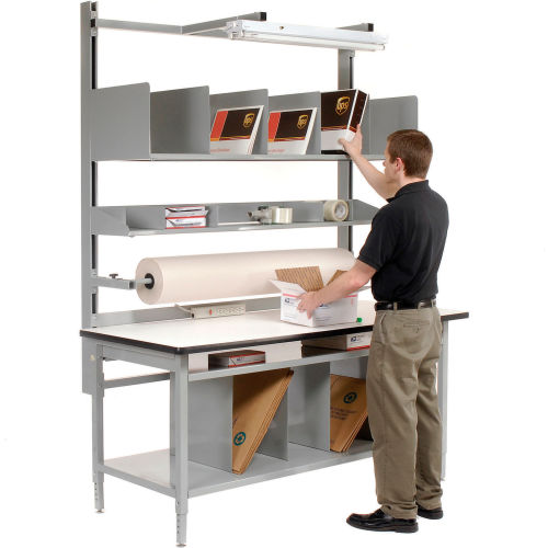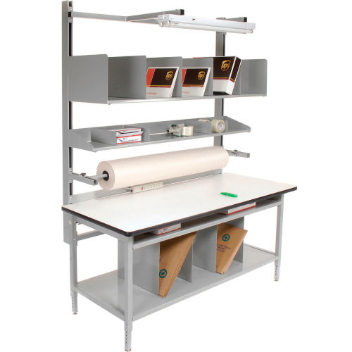 Complete packaging workbenches include everything you need for a productive, effective packaging station. These benches are built with numerous storage options that keep all your packaging supplies and needs organized and within reach. The variety of storage options allows this packing bench to hold supplies such as tools, packaging boxes, cartons and large envelopes. The durable steel workbench is built to last, and its framing has a light gray finish. Legs are height adjustable from to 36" and include adjustable leveling feet. This packing workbench has an overall dimension of 72"L x 30"W x - 36"H. 1-1/4" thick plastic laminate top. Includes: Full lower shelf with four 18" x 18" dividersFull width storage shelf with 4" of clearanceUR72 uprightsBin holder6 outlet power supplyPaper spool holderEnclosed metal shelf 12" deep with four dividersCorrugated storage shelf with four 12" x 18" dividersShop lightHardware included.