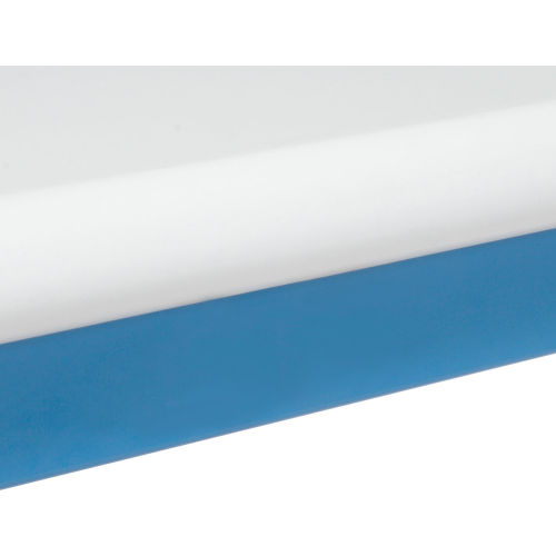 The packing workbench comes with a riser kit for user convenience. This workbench features 1-5/8" thick plastic safety edge top supported by heavy-duty 2" square 14 gauge steel tubular legs that adjust from 29-7/8 - 41-3/4"H at 2" increments and are tested to 5000 lbs capacity, ensuring the weight is evenly distributed. It includes adjustable levelling floor glides and levelling foot plates that allow floor anchoring. This workbench has a powder coat finish, and it is quick and easy to assemble. The riser kit includes 48"H uprights, bin rail, reel holder, two 12" depth shelves (1 with 6 adjustable carton dividers), and a 72"W LED light kit.