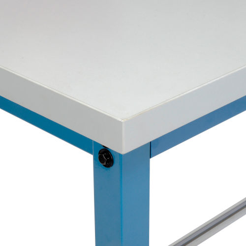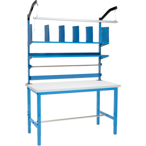 The packing workbench comes with a riser kit for user convenience. This workbench features 1-5/8" thick plastic square edge top supported by heavy-duty 2" square 14 gauge steel tubular legs that adjust from 29-7/8 - 41-3/4"H at 2" increments and are tested to 5000 lbs capacity, ensuring the weight is evenly distributed. It includes adjustable levelling floor glides and levelling foot plates that allow floor anchoring. This workbench has a powder coat finish, and it is quick and easy to assemble. The riser kit includes 48"H uprights, bin rail, reel holder, two 12" depth shelves (1 with 6 adjustable carton dividers), and a 60"W LED light kit.