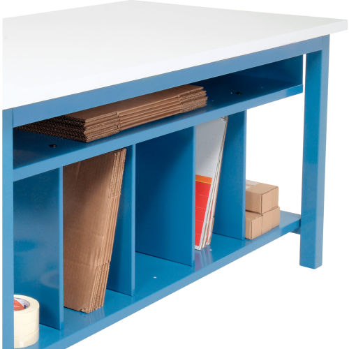 The packing workbench includes a lower shelf kit. This workbench features 1-1/4" thick ESD square edge top supported by heavy-duty 2" square 14 gauge steel tubular legs that adjust from 29-9/16 - 41-7/16"H at 2" increments and are tested to 5000 lbs capacity, ensuring the weight is evenly distributed. It includes adjustable levelling floor glides and levelling foot plates that allow floor anchoring. This workbench has a powder coat finish, and it is quick and easy to assemble. The lower shelf kit measures 25"D with 4 carton dividers and a has 5"H storage shelf.