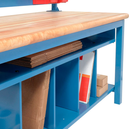 ✓ Rounded, safety-edge maple Boos butcher block by John Boos & Co. ✓ High weight capacity to handle most projects and tasks ✓ Purpose-built for packing with power apron The complete packing workbench includes a riser kit, and lower shelf kit. This workbench features 1-3/4" thick maple safety edge top supported by heavy-duty 2" square 14 ga steel tubular legs that adjust from 30-1/16 - 41-15/16"H at 2" increments and are tested to 5000 lbs capacity, ensuring the weight is evenly distributed. It includes adjustable levelling floor glides and levelling foot plates that allow floor anchoring. This workbench has a powder coat finish, and it is quick and easy to assemble. The riser kit includes 48"H uprights, bin rail, reel holder, two 12" depth shelves (1 with 6 adjustable carton dividers), and a 72"W LED light kit. The lower shelf kit measures 25"D with 4 carton dividers and a has 5"H storage shelf.