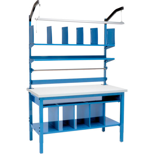The complete packing workbench includes a riser kit, and lower shelf kit. This workbench features 1-1/4" thick ESD square edge top supported by heavy-duty 2" square 14 gauge steel tubular legs that adjust from 29-9/16 - 41-7/16"H at 2" increments and are tested to 5000 lbs capacity, ensuring the weight is evenly distributed. It includes adjustable levelling floor glides and levelling foot plates that allow floor anchoring. This workbench has a powder coat finish, and it is quick and easy to assemble. The riser kit includes 48"H uprights, bin rail, reel holder, two 12" depth shelves (1 with 6 adjustable carton dividers), and a 60"W LED light kit. The lower shelf kit measures 25"D with 4 carton dividers and a has 5"H storage shelf.