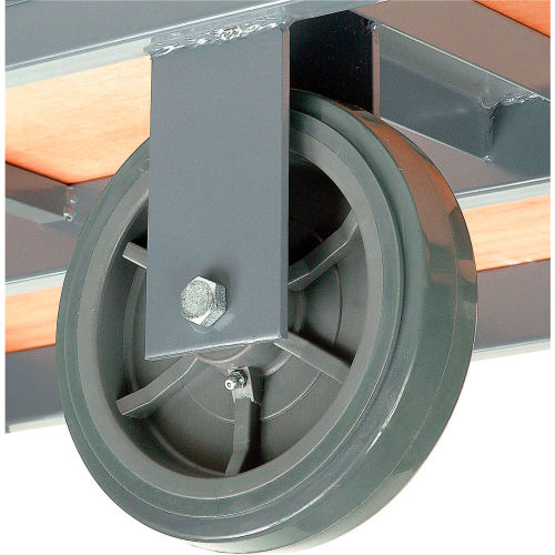 Best Value Wood Deck Narrow Aisle High End U-Boat Platform Truck 60 x 16 1500 Lb. Capacity - 168002 Handles more merchandise than several hand trucks and stock carts combined. Narrow deck width design simplifies movement in confined spaces, aisles or hallways. Six-wheel caster configuration allows truck to turn on its own radius. Twin removable handles allow transport of oversized cargo. Steel bound 5/8" Plywood Deck has durable polyurethane finish and 1500 lb. capacity for maximum strength in toughest applications. Two rigid 8" polyurethane wheels and four swivel 4" rubber casters with a 12" deck height. Durable powder coat finish. Optional Steel Shelves offer additional shelf space, as each truck can accommodate two shelves (350 lb. capacity per shelf).