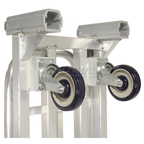 New Age FOLDING ALUMINUM NARROW AISLE, HIGH END PLATFORM TRUCK This platform truck permits fast, easy maneuvering in tight areas with folding handles and large central wheels that turn truck on its radius. Indispensable material handling equipment for operations such as grocery, food and beverage distributors, warehouses and trucks. All-welded aluminum construction withstands corrosive environments and makes this platform truck 40% lighter than comparable steel platform trucks while providing a 1,500 lb. capacity. Folding handles help truck fit into loaded vehicles and stow easily when not in use. Handles latch in place to keep truck safely folded and lock into rugged sockets when in use. Platform truck measures only 14" deep when folded and stands easily on end. Measures 63"L x 16"W x 61"H overall with a 9-1/2" deck height. Four 5" x 1-1/2" swivel end casters and two 6" x 2" rigid center casters are non-marring polyurethane and turn truck on its radius. Lifetime Limited Warranty.