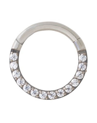 Piercing Type: Multiple Material: Titanium Accent Material: Titanium Available in multiple sizes Interior Diameter: 10.4mm Stone Type: Clear cubic zirconia Clip closure Jewelry Care: Clean with antibacterial soap and warm water Piercing Care: Clean with H2Ocean Aftercare Spray (sold separately) or saline solution Imported Note: Do not use any harsh, alcohol-based chemicals as this may cause tarnishing Wear in healed piercings only. If irritation occurs, remove immediately. This is a decorative item and should not be worn to sleep.